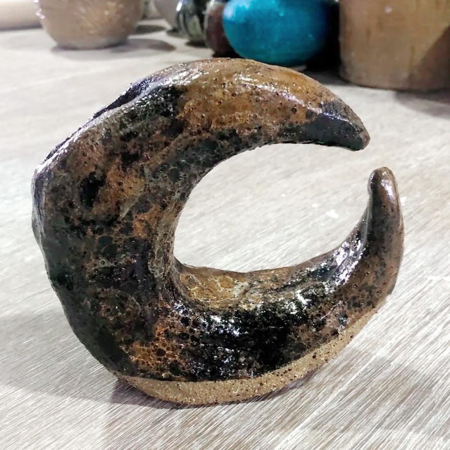 This piece is hand-built locally in Brisbane by Katie. Small vase ( 13cm x 13cm). The vase is in the shape of a crescent moon with a brown glaze and a black bubble glaze on top. Available for pick-up by arrangement in Fairfield, Brisbane or via post for a flat fee. Please note: Colours may appear different on your screen. As these are hand-built, no two pieces are the same are may be slightly different from pictured.